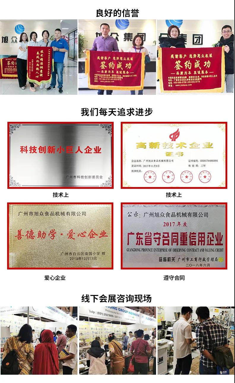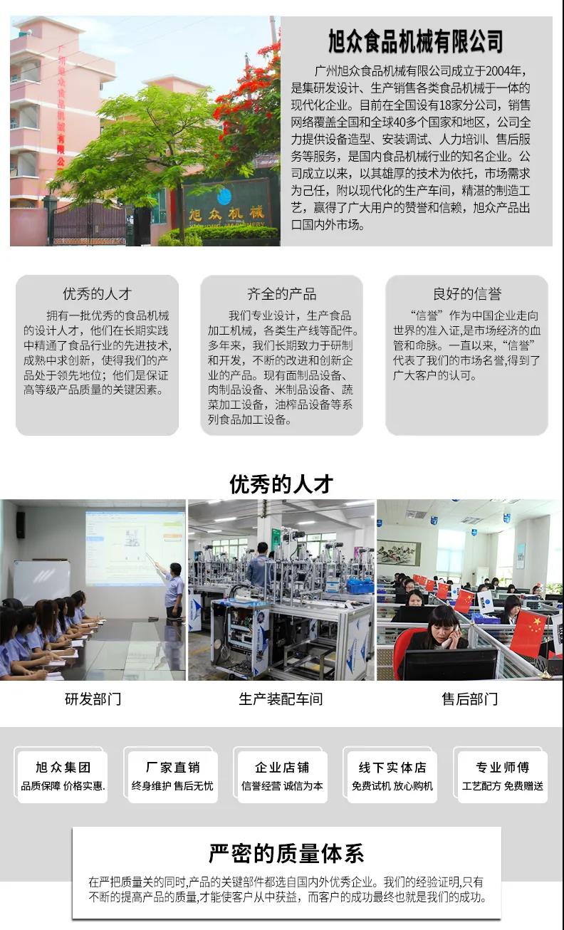 廣州旭眾食品機(jī)械有限公司是一家集科研開(kāi)發(fā),生產(chǎn)設(shè)計(jì),營(yíng)銷服務(wù)為一體的現(xiàn)代化生產(chǎn)企業(yè)?,F(xiàn)代化生產(chǎn)車間,精湛制造技術(shù),所產(chǎn)機(jī)械歷經(jīng)市場(chǎng)重重考驗(yàn),不斷贏得海內(nèi)外客戶的贊譽(yù)。